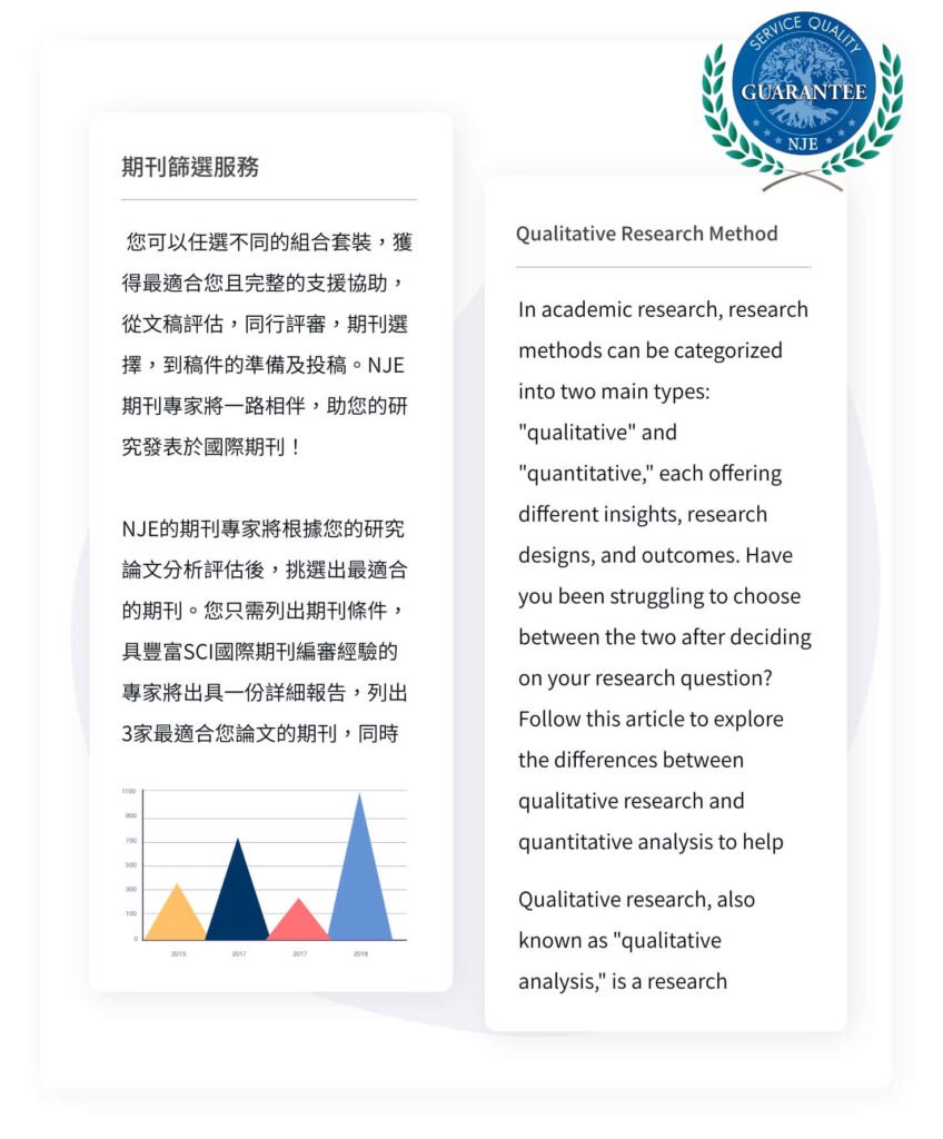SCOPUS 致力於將您的學術成果推向國際。NJE 的資深編輯&學科專家擁有豐富的國際期刊投稿經驗將全方位評估您的文稿, 協助您的研究論文在國際期刊上發表。